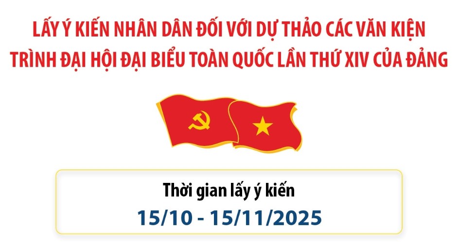 Ngày 15/10/2025, Ban Chấp hành Trung ương Đảng khóa XIII công bố toàn văn dự thảo các văn kiện trình Đại hội đại biểu toàn quốc lần thứ XIV của Đảng, để lấy ý kiến đóng góp của các đại biểu Quốc hội, Mặt trận Tổ quốc, các tổ chức chính trị-xã hội, các đoàn thể nhân dân, cán bộ, đảng viên và nhân dân. Theo kế hoạch, thời gian lấy ý kiến góp ý của nhân dân từ ngày 15/10 - 15/11/2025.