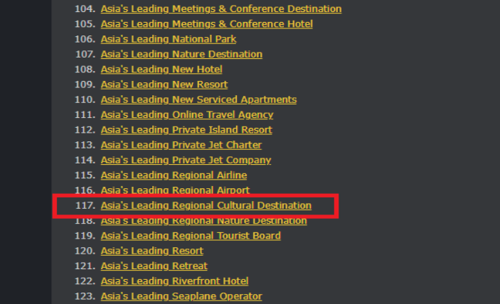 - Bước 3: Tìm đến hạng mục giải thưởng số 117 (khoanh đỏ trong hình) - Giải hạng mục "Asia's Leading Regional Cultural Destination (Điểm đến Văn hóa khu vực hàng đầu châu Á)".