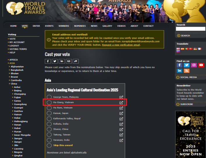 - Bước 4: Chọn hạng mục "Asia's Leading Regional Cultural Destination (Điểm đến Văn hóa khu vực hàng đầu châu Á)" và ấn vào ô tròn trước tên Ha Giang, Vietnam.