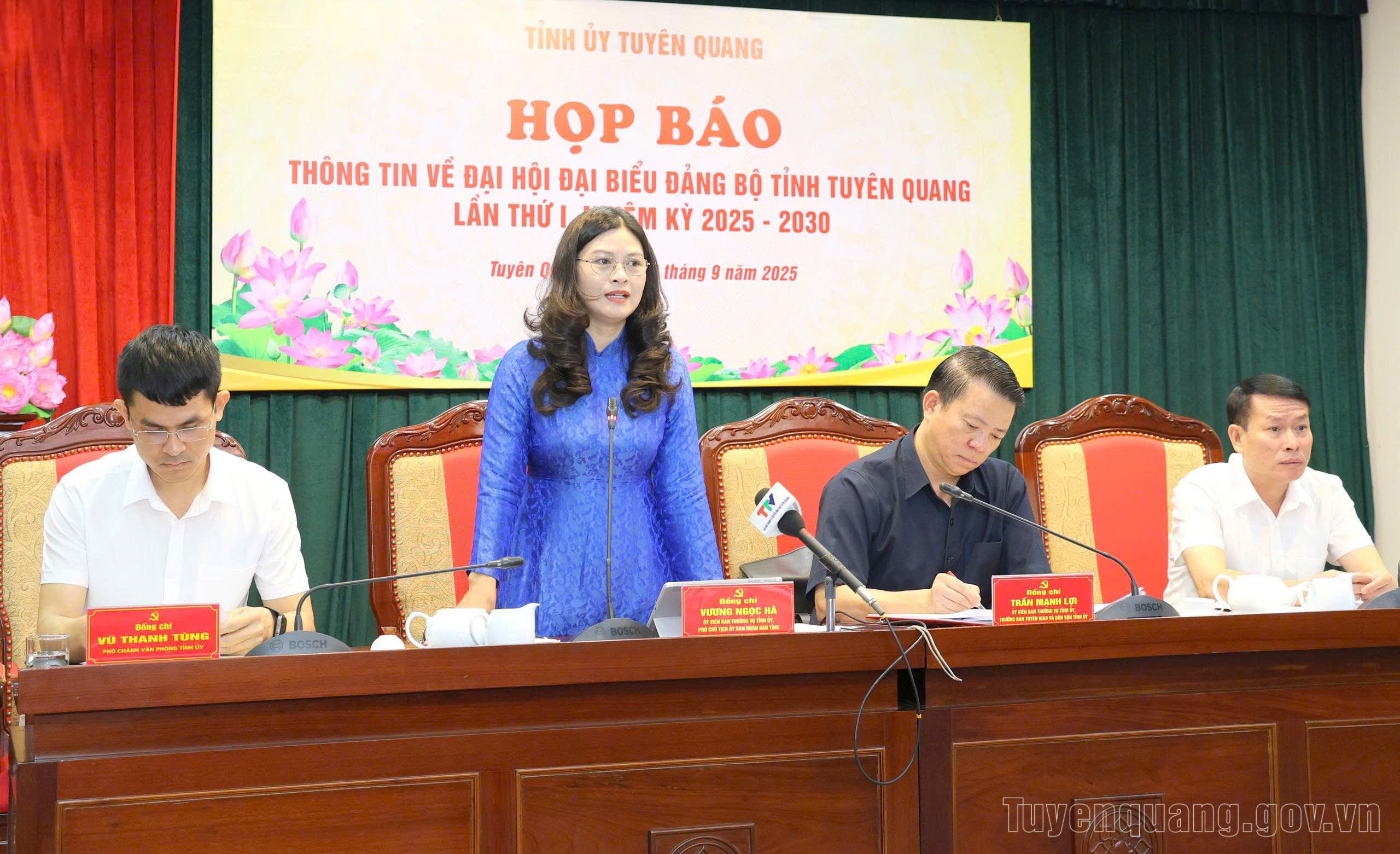 Tại buổi họp báo, các đại biểu được nghe báo cáo tóm tắt kết quả đại hội cấp trên trực tiếp cơ sở và Đảng bộ xã, phường nhiệm kỳ 2025-2030; Báo cáo tóm tắt kết quả công tác chuẩn bị Đại hội đại biểu Đảng bộ tỉnh Tuyên Quang lần thứ I, nhiệm kỳ 2025-2030. Đồng thời nghe thông báo việc tổ chức và hoạt động của Phòng Báo chí Đại hội đại biểu Đảng bộ tỉnh Tuyên Quang lần thứ I, nhiệm kỳ 2025-2030 và Quy định hoạt động nghiệp vụ của phóng viên báo chí tại Đại hội.