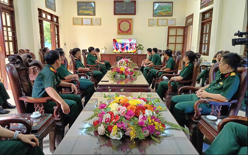 Cán bộ chiến sỹ Trung đoàn 877, Bộ Chỉ huy Quân sự tỉnh theo dõi Đại hội Đảng bộ tỉnh. Ảnh: Lê Hải