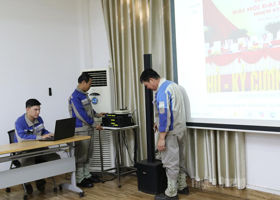 Nhân viên Công ty Gang thép Tuyên Quang chuẩn bị màn chiếu để xem truyền hình trực tiếp Đại hội đại biểu Đảng bộ tỉnh.