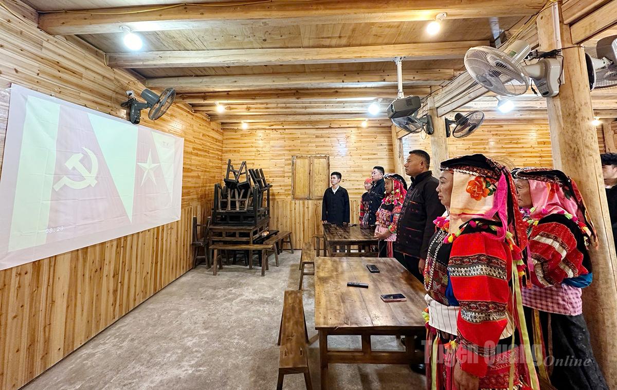 Người dân thôn Lô Lô Chải, xã Lũng Cú tập trung theo dõi Đại hội tại nhà Trưởng thôn. Ảnh: My Ly