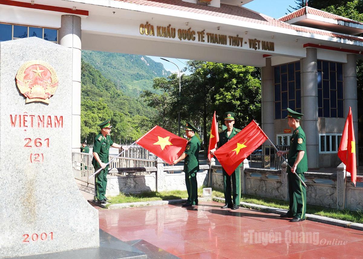 Cán bộ Đồn Biên phòng Cửa khẩu Quốc tế Thanh Thủy treo cờ tại mốc 261.