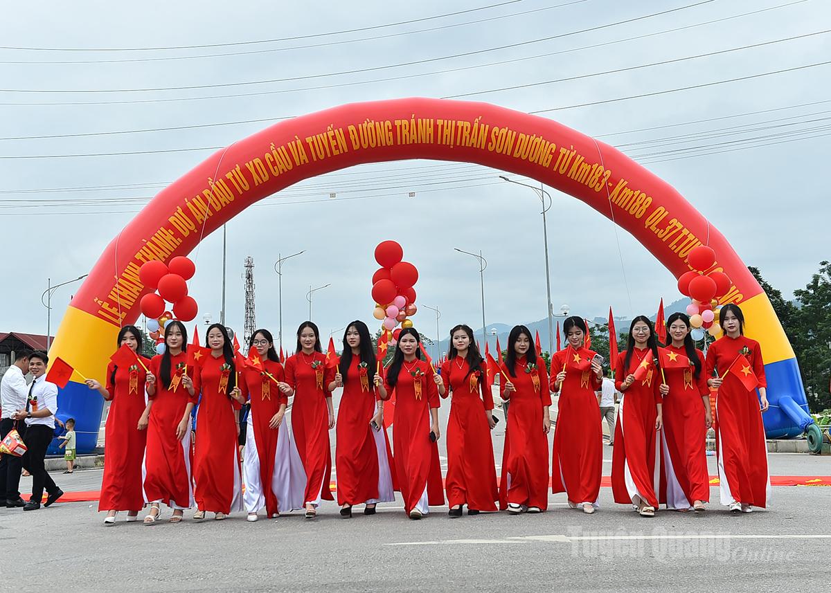 Niềm vui của người dân và các em học sinh nhân dịp khánh thành công trình cầu và đường tránh trung tâm xã Sơn Dương, công trình chào mừng Đại hội Đảng các cấp.