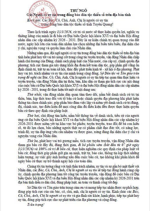 Sở Dân tộc và Tôn giáo gửi Thư ngỏ đề nghị Người có uy tín trên địa bàn tỉnh tích cực tuyên truyền, vận động nhân dân tham gia bầu cử Quốc hội khóa XVI và đại biểu HĐND các cấp nhiệm kỳ 2026_2031