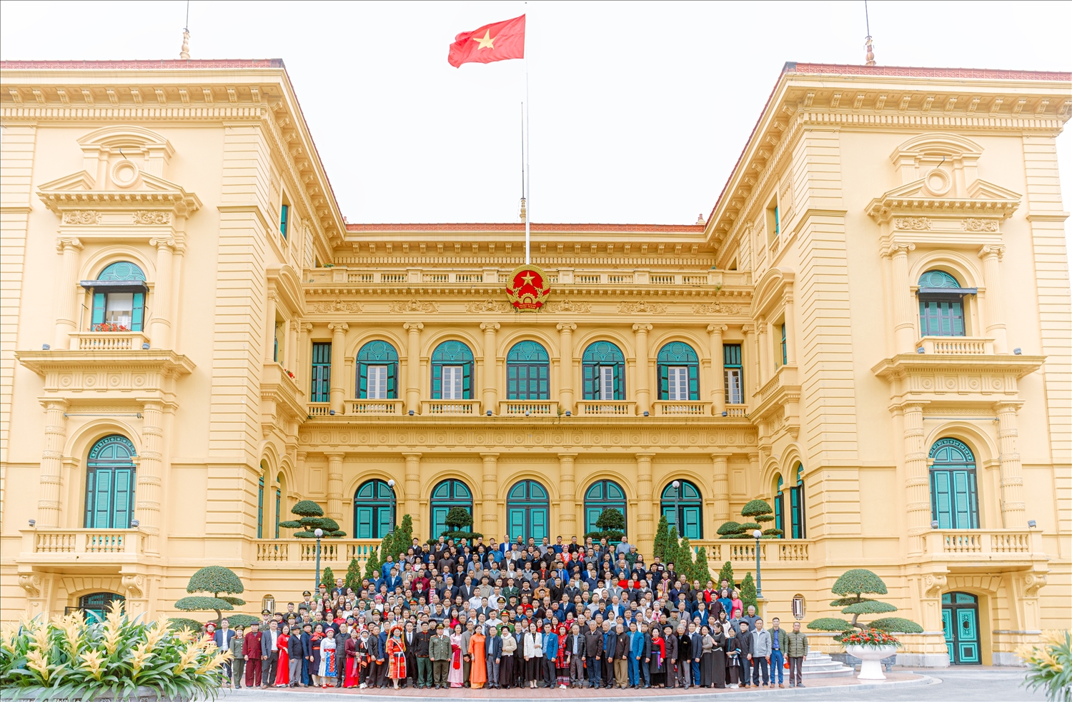Lãnh đạo Vụ Tuyên truyền công tác dân tộc, tôn giáo (Bộ Dân tộc và Tôn giáo) và lãnh đạo tỉnh Tuyên Quang trao biểu trưng, tặng hoa và chụp ảnh lưu niệm cùng các điển hình tiên tiến trong đồng bào các DTTS tỉnh Tuyên Quang