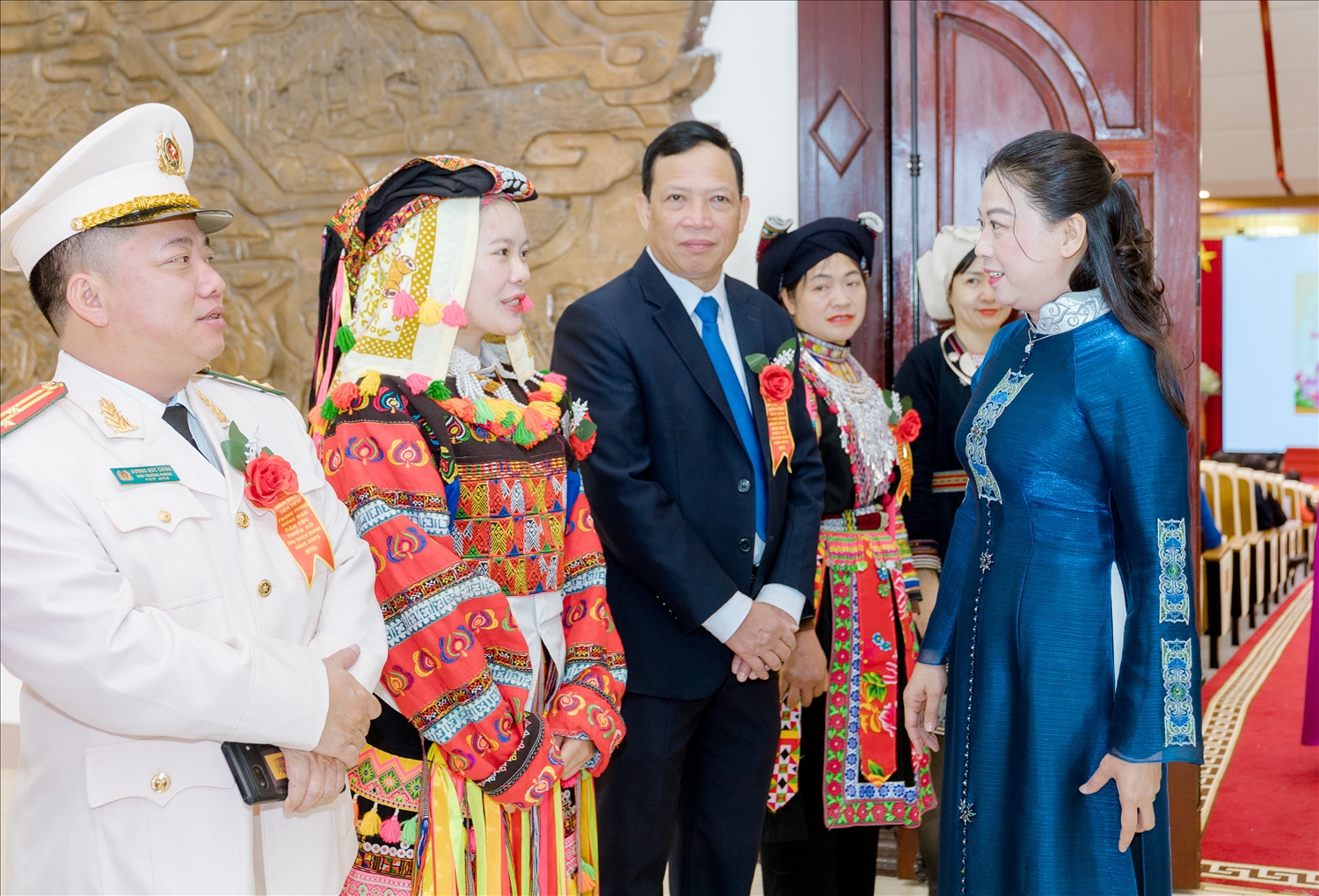 Phó Bí thư Thường trực Tỉnh ủy Tuyên Quang Lê Thị Kim Dung trò chuyện, động viên các cá nhân là điển hình tiên tiến vùng đồng bào DTTS tỉnh Tuyên Quang năm 2025