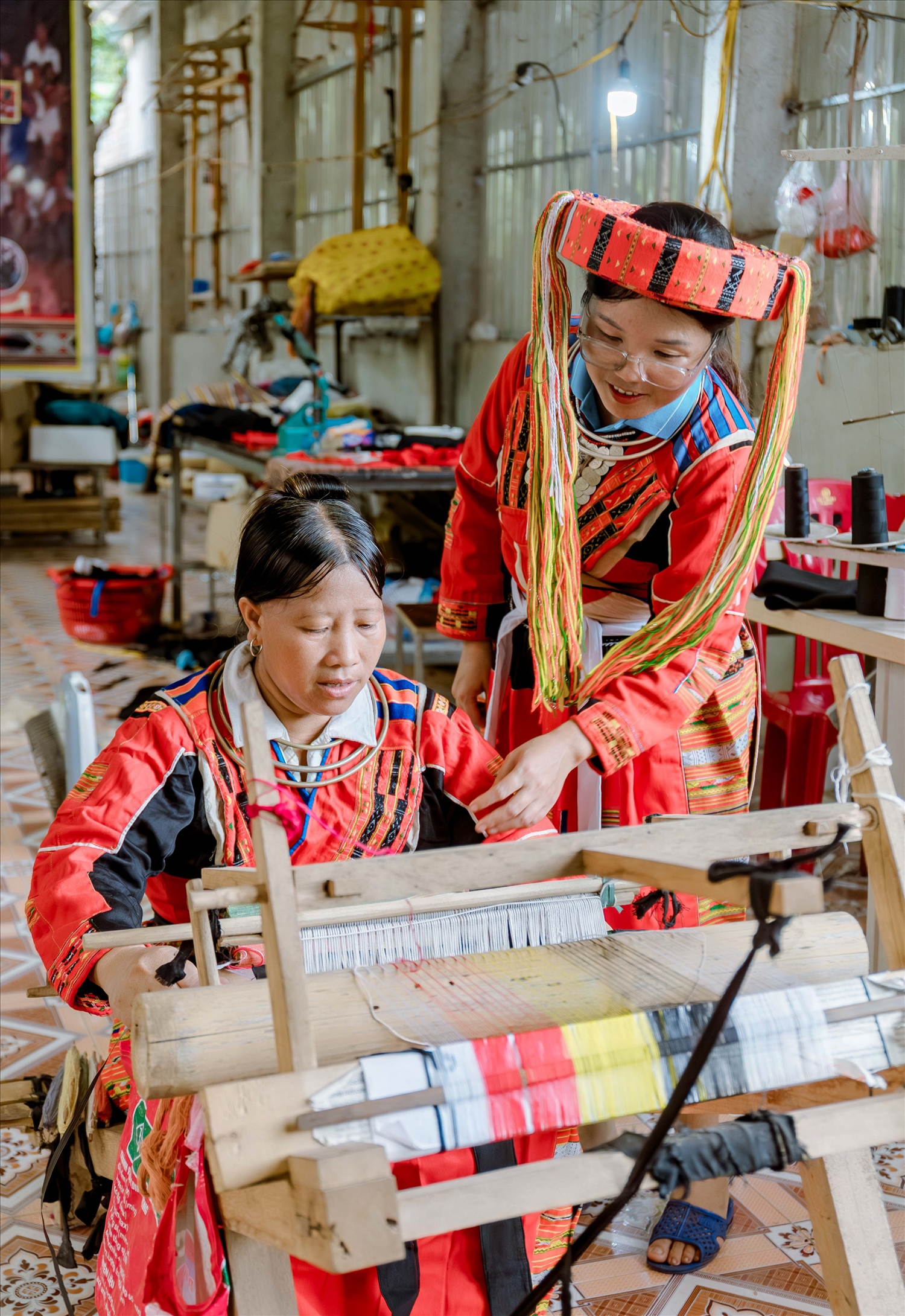 Chị Tải Thị Mai (bên trái) Giám đốc HTX dệt thổ cẩm thôn My Bắc, xã Tân Trịnh là gương điển hình tiên tiến trong việc bảo tồn văn hóa truyền thống trên trang phục của đồng bào dân tộc Pà Thẻn